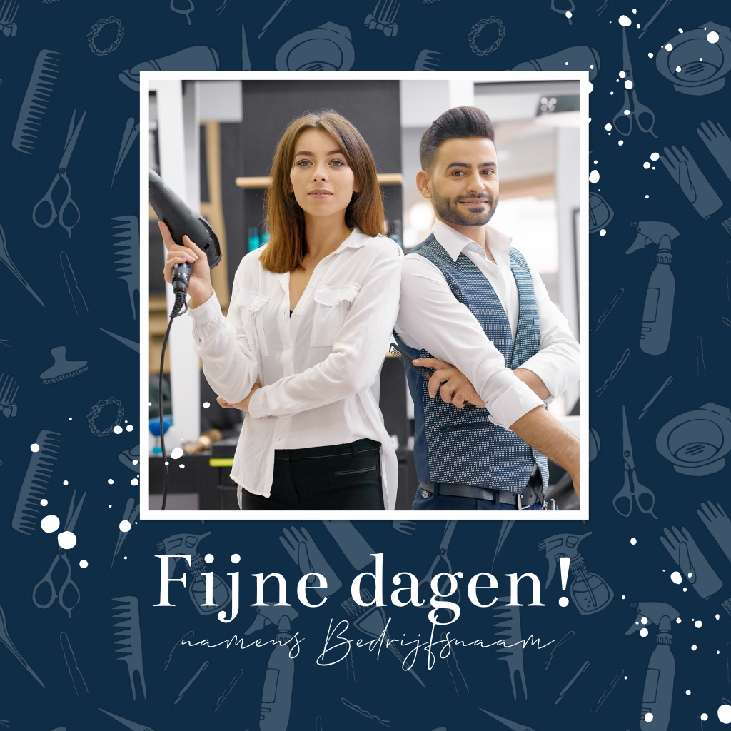Donkerblauwe kerstkaart met patroon van kapsalon items, zoals schaartje, kam en handschoenen. Voorop is ruimte voor een eigen foto van jullie team. De goudfolie spetters en typografie maken dit tot een feestelijke kaart. Pas dit ontwerp zelf aan in onze editor en bestel een proefdruk.