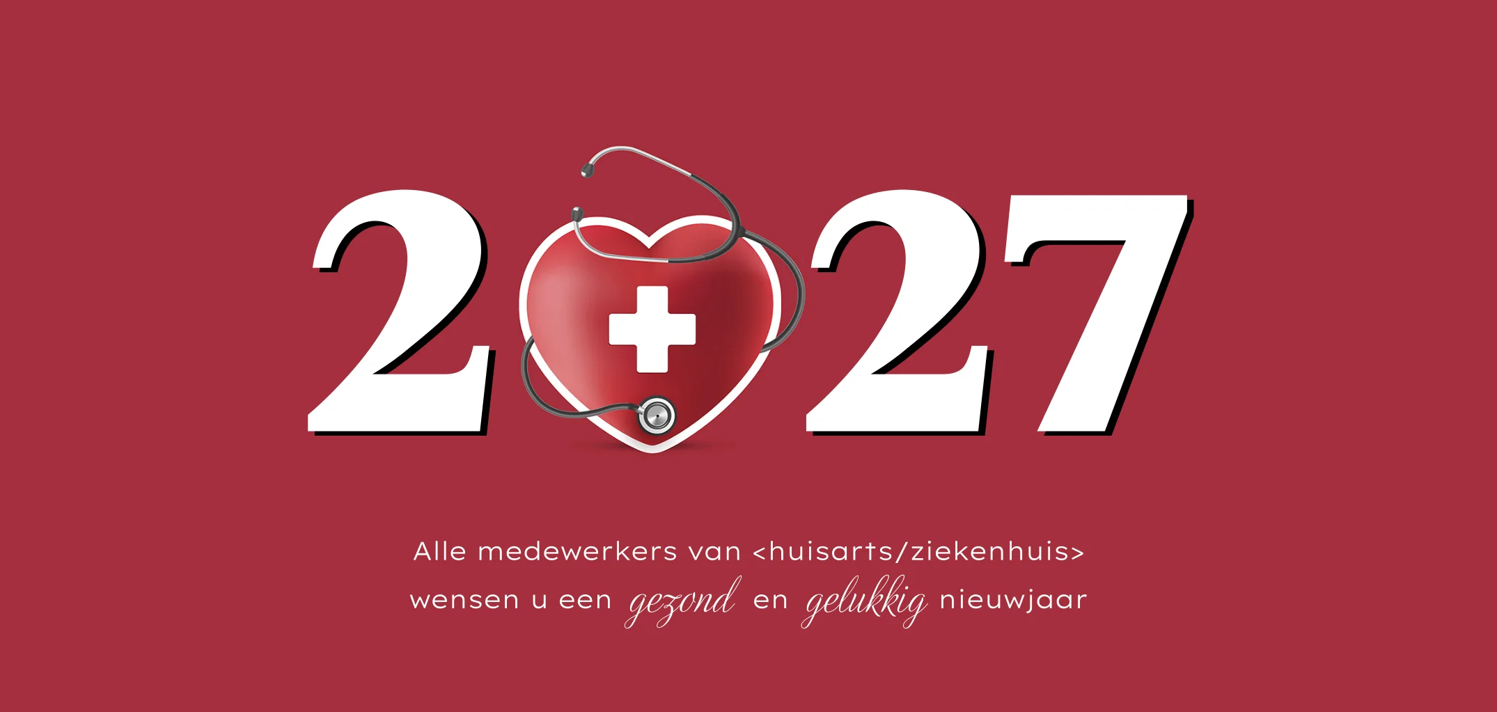 Ontdek deze stijlvolle kerstkaart voor de zorg, met een strakke rode achtergrond. De '0' van 2027 vormt een hart met stetoscoop erop. Geschikt voor zowel huisartsenpraktijken als ziekenhuizen. Bestel gerust een drukproef om de kaart in het echt te bekijken voordat je deze verstuurt. Een passende manier om waardering te tonen tijdens de feestdagen.