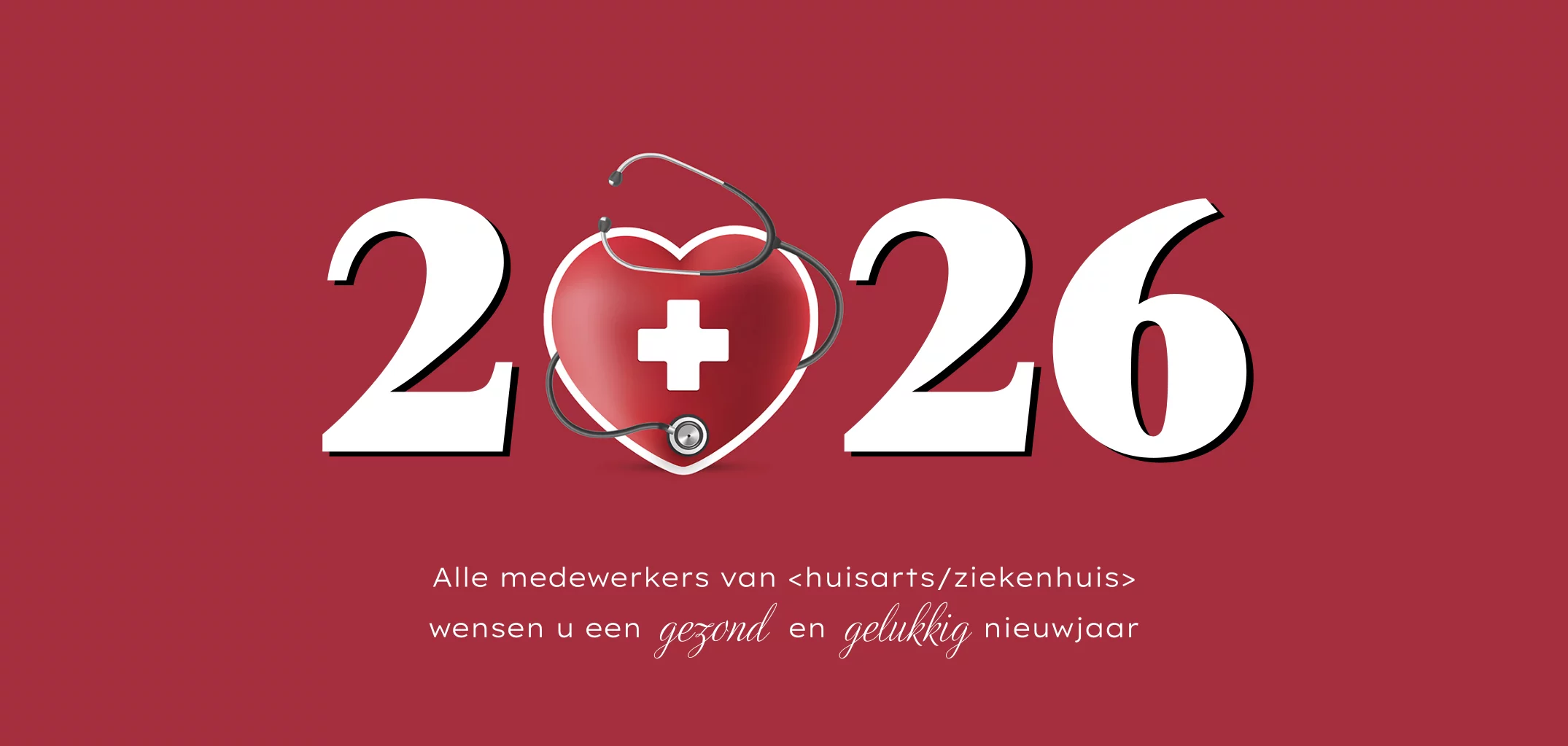 Ontdek deze stijlvolle kerstkaart voor de zorg, met een strakke rode achtergrond. De '0' van 2026 vormt een hart met stetoscoop erop. Geschikt voor zowel huisartsenpraktijken als ziekenhuizen. Bestel gerust een drukproef om de kaart in het echt te bekijken voordat je deze verstuurt. Een passende manier om waardering te tonen tijdens de feestdagen.
