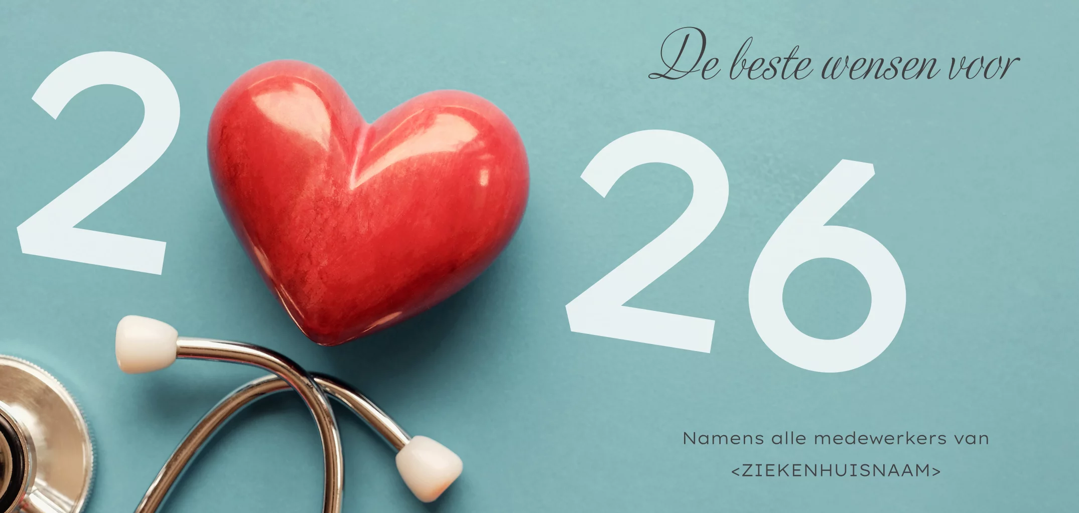 Blauwe kerstkaart met 2026 waarbij ipv de '0' een rood hart ligt. Eronder ligt een stethoscoop. Ben je nieuwsgierig naar deze bijzondere kerstkaart? Bestel een proefdruk en bewonder het gedrukte resultaat. Een unieke manier om je waardering uit te drukken voor de zorgsector tijdens de feestdagen.