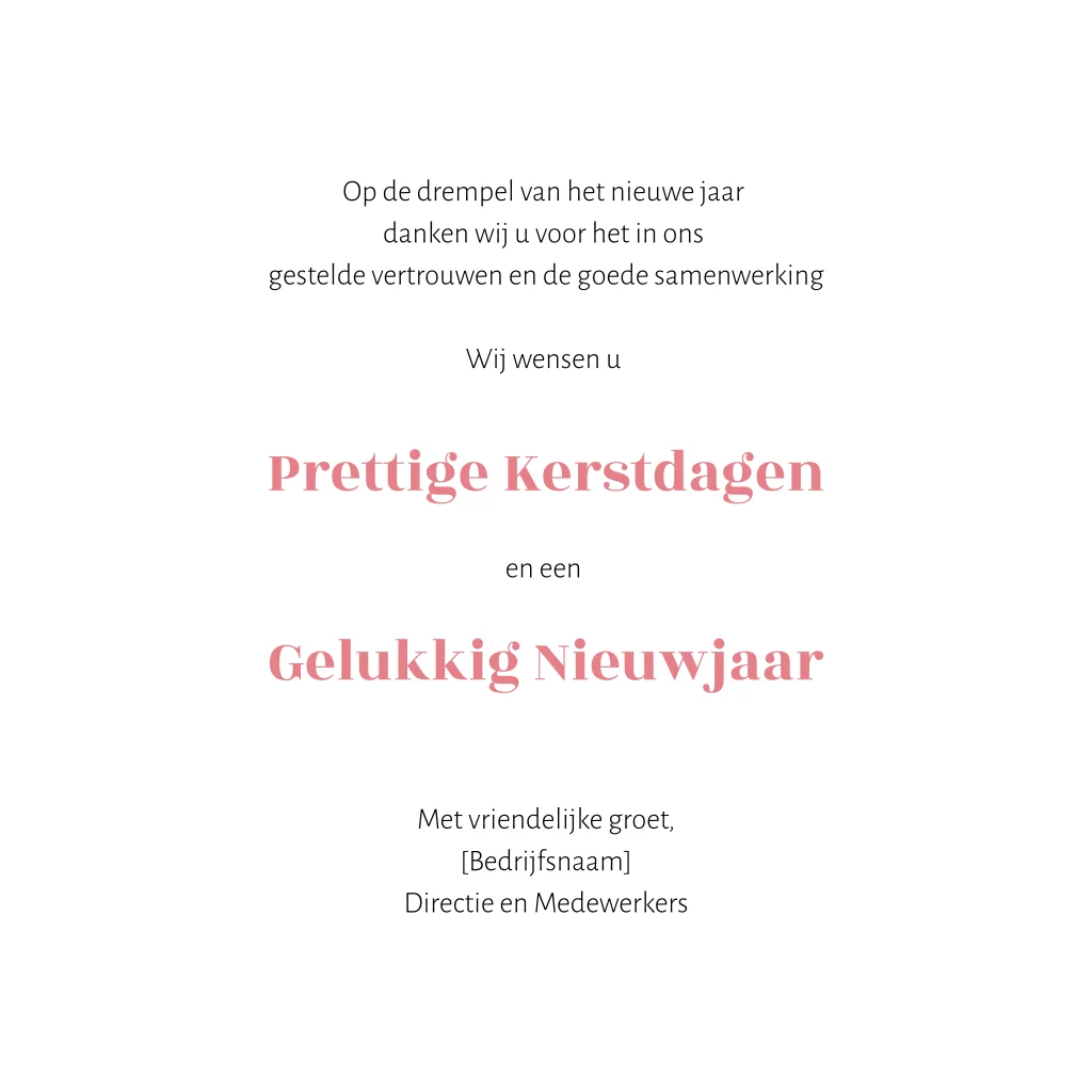 Deze zakelijke kerstkaart in roze tinten nodigt uit tot rust en ontspanning, precies zoals de wellness sector dat doet. De kalmerende kleuren en het zorgvuldig gekozen ontwerp weerspiegelen de rust en balans die zo kenmerkend zijn voor uw branche. Deze kaart is een uitnodiging om even een moment voor uzelf te nemen, te ademen en te genieten van de feestdagen. Voeg uw eigen persoonlijke boodschap en bedrijfslogo toe om deze kaart nog specialer te maken en uw waardering te tonen.